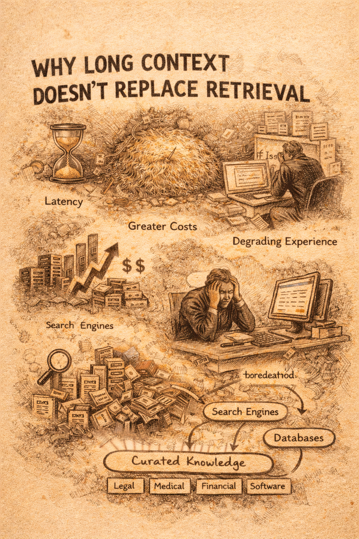 This also explains why longer context windows don’t eliminate retrieval. If they did, we’d already be talking about the end of search engines and databases. Instead, every serious domain, finance, law, medicine, software, relies on curated, attributable knowledge bases. Bigger context doesn’t remove the need to find information efficiently.